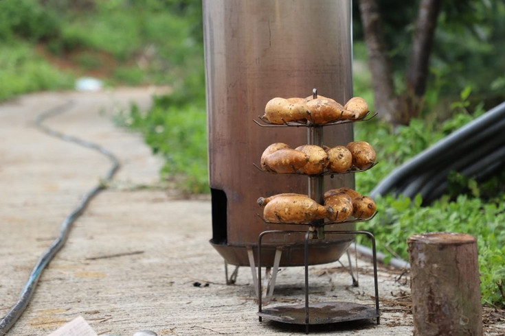 想吃沒那麼簡單,自己劈柴先,選用紋路直直的木頭,這樣會更加輕鬆不費力唷!再來準備來烤地瓜了,這57號地瓜聽說來頭不小啊!來自雲林縣水林鄉,口感鬆軟、富含焦糖味,料理方式使用烤桶仔雞的爐子,多了一個配件,專門設計給地瓜烤熟使用,一物多用,這樣地瓜不會沾滿土,也可以時時打開來看避免過熟,庄腳人果然處處都是智慧。